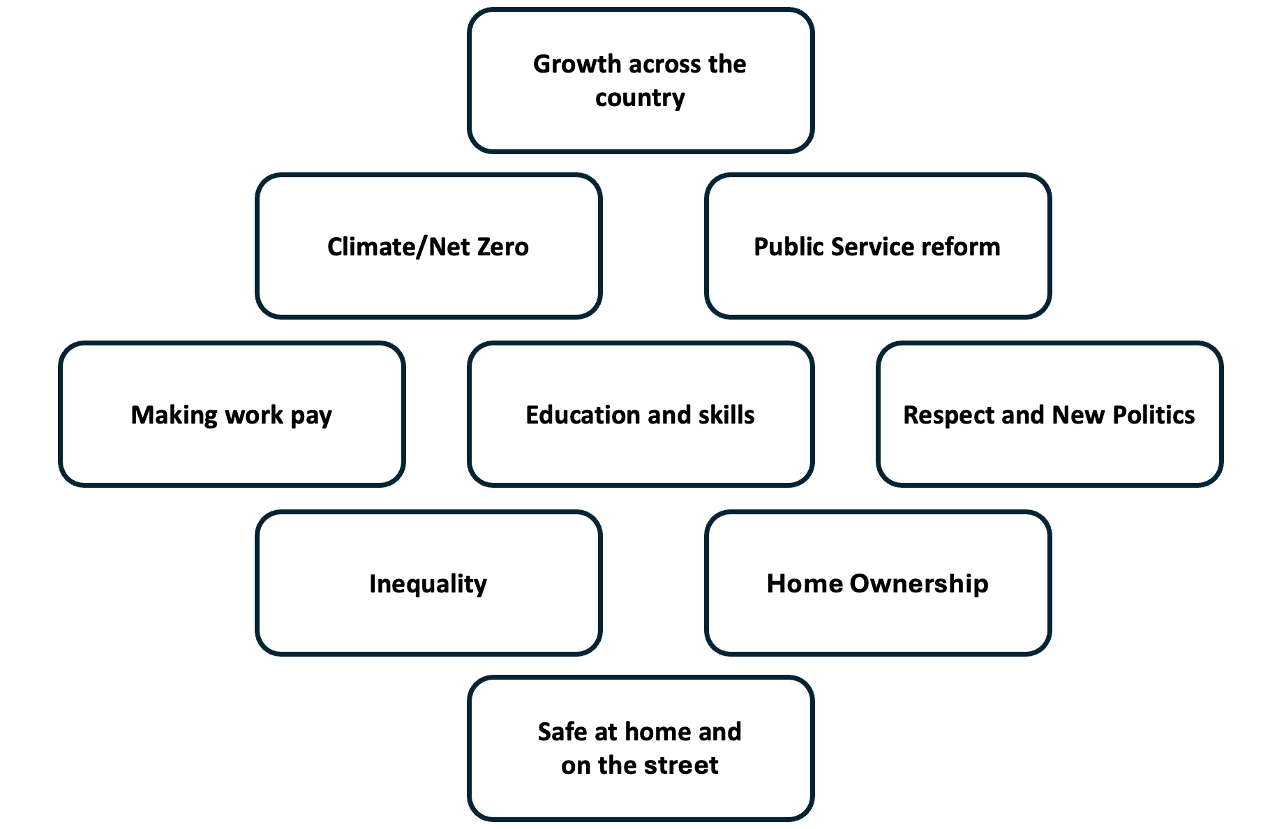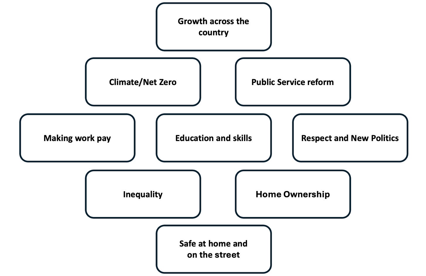 As the diamond shape started to form, I tried to probe his thinking. How did he see the relationship between growth and tackling inequality? Should climate change be in the second row? Was the reason that public service reform was so high because it was a catch-all that allowed him to cover both health and crime?